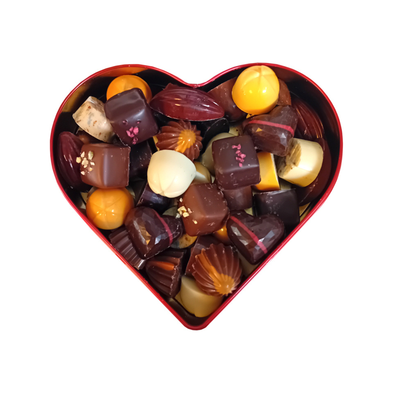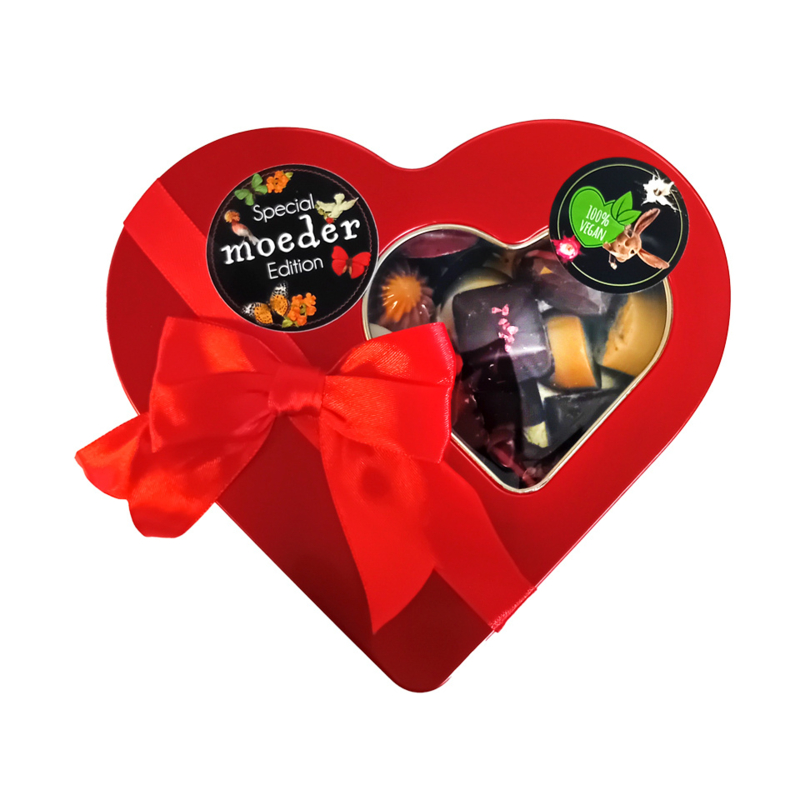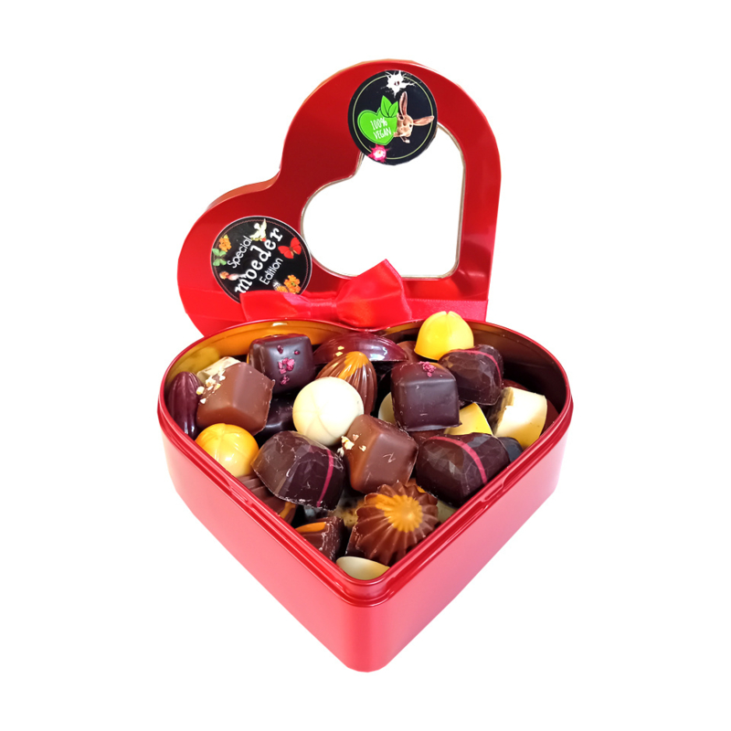 • Rood hartvormig snoepblik met ca. 30 Vegan bonbons