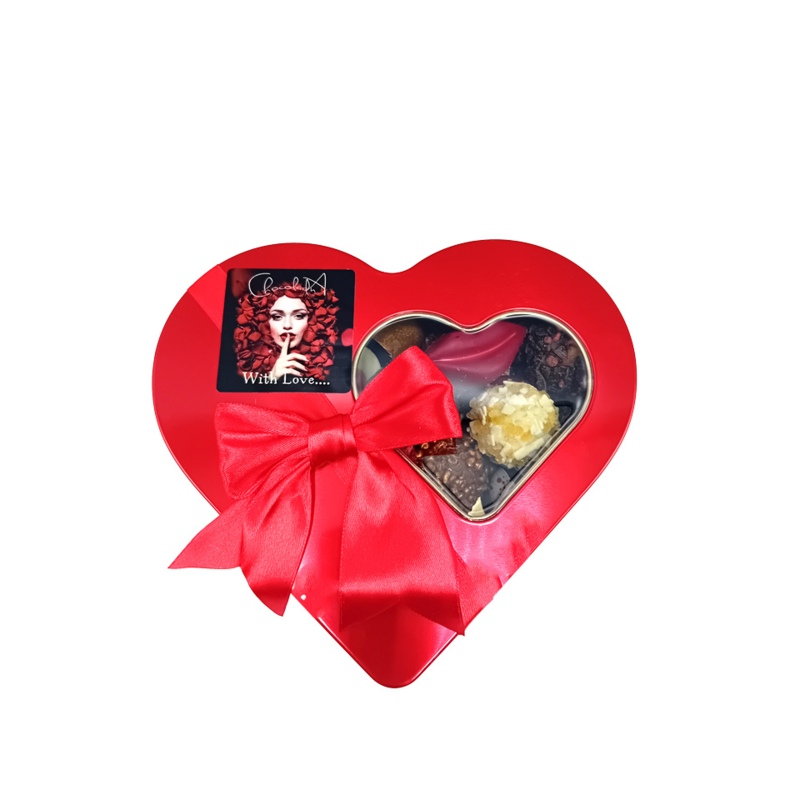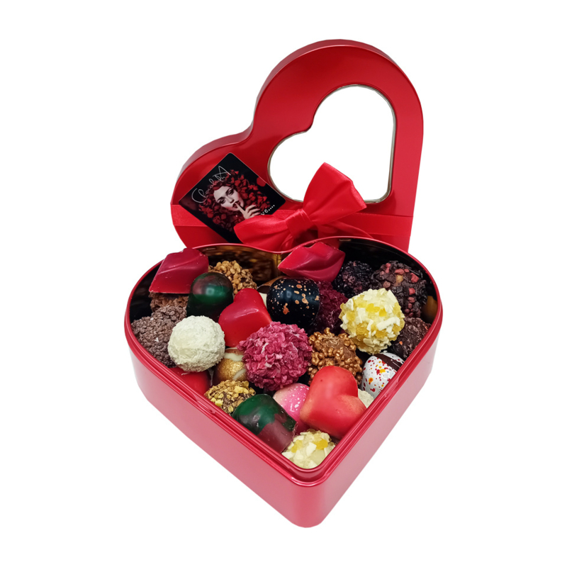 Artikelnummer: Hart blik loveLiefde smaakt nog zoeter met dit luxe rode hartvormige snoepblik! Gevuld met ca. 30 handgemaakte truffels en bonbons, straalt dit cadeau pure romantiek uit. De chocolaatjes zijn uitgevoerd in de kleuren en smaken van de liefde, perfect gecombineerd voor een onvergetelijke smaaksensatie.