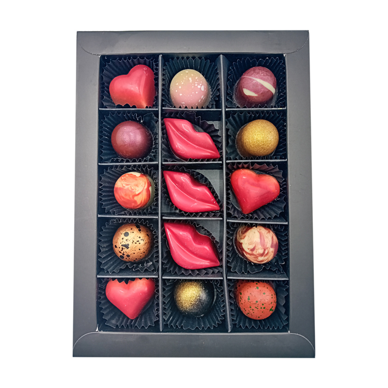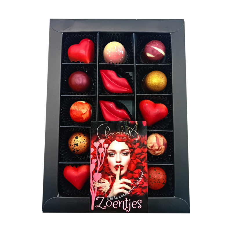 Ruime Keuze aan Smaak: Een prachtig en lekker assortiment van 15 ambachtelijke bonbons en zoentjes & hartjes. Voor ieder cadeaumoment hebben wij een passende selectie.