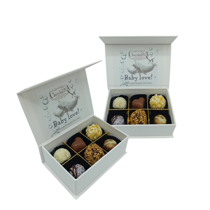 Ontdek onze exclusieve chocoladeverrassingen, perfect voor de komst van een kleintje. Geniet van handgemaakte chocoladetruffels, pralines, en schattige witte chocolade schaapjes, allemaal in een stijlvolle neutrale verpakking.