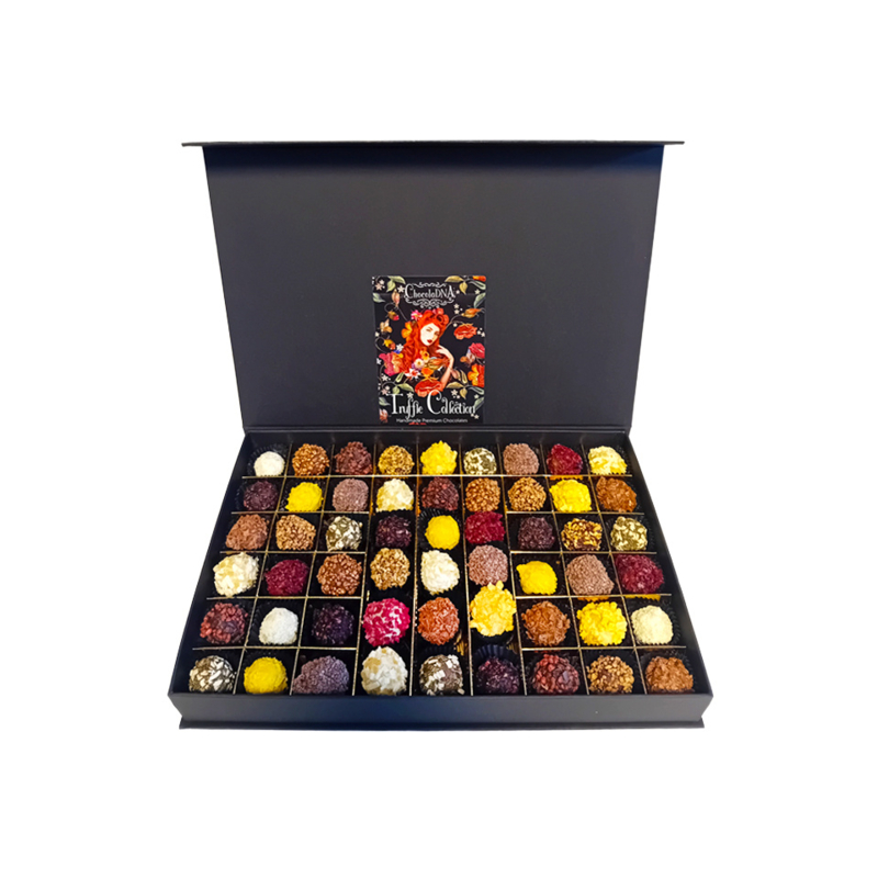 Klein doosje met onze 54 Beroemde Kleurrijke Truffels Van-Eker Chocolade, waar elke viering wordt omgetoverd tot een onvergetelijke ervaring dankzij onze exclusieve collectie chocolade. Speciaal voor echte chocoholics