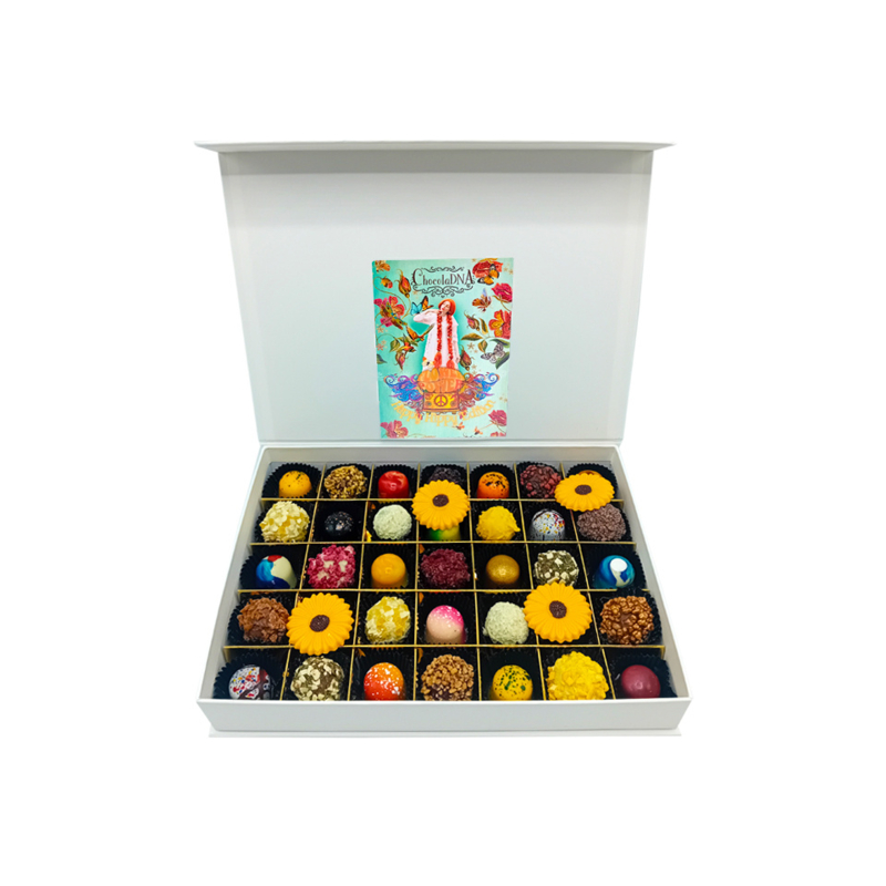 Trakteer jezelf of iemand anders op een betoverende mix van onze handgemaakte chocolade kunstwerkjes. Vol bloemige smaken en zomerse vibes, perfect voor kleurrijke dagen! Denk aan roos, orchidee, korenbloem, saffraan, basilicum...