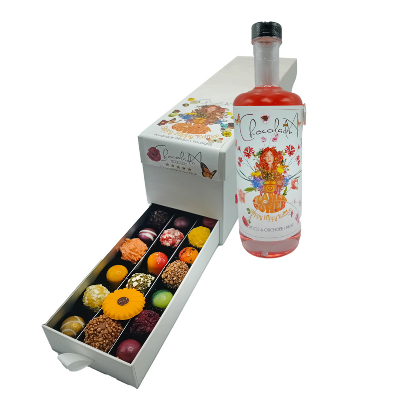 Chocolade lade-box 70CL fles Flower likeur en kleurrijke Chocolade naar keuze: