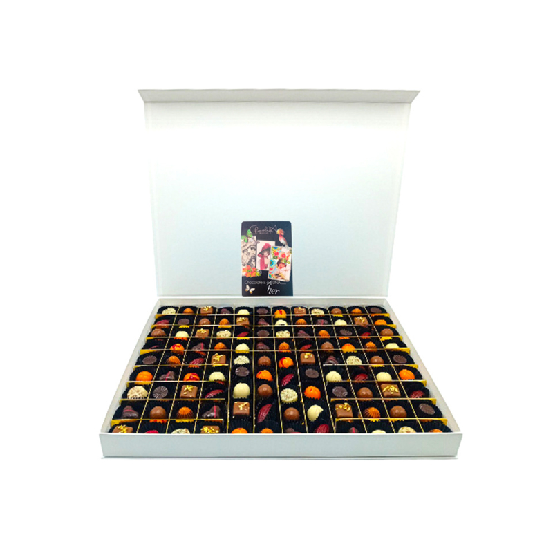 Ontdek ons speciale chocolade-assortiment en onze eigen karamel-zeezout likeur met goudvlokken, speciaal samengesteld voor de liefste moeders en vrouwen van de hele wereld.